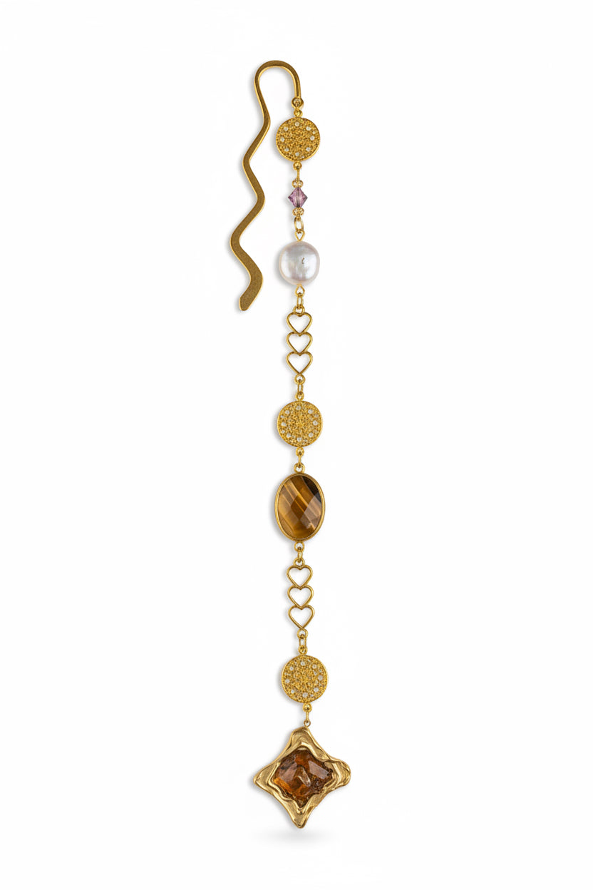 Ett elegant bokmärke i gyllene toner med skimrande kristaller, hjärtformade detaljer, en mjuk pärla och tigeröga i varmt bärnstensbrunt. Designen balanserar romantik och styrka och känns som ett ärvt smycke från en annan tid.