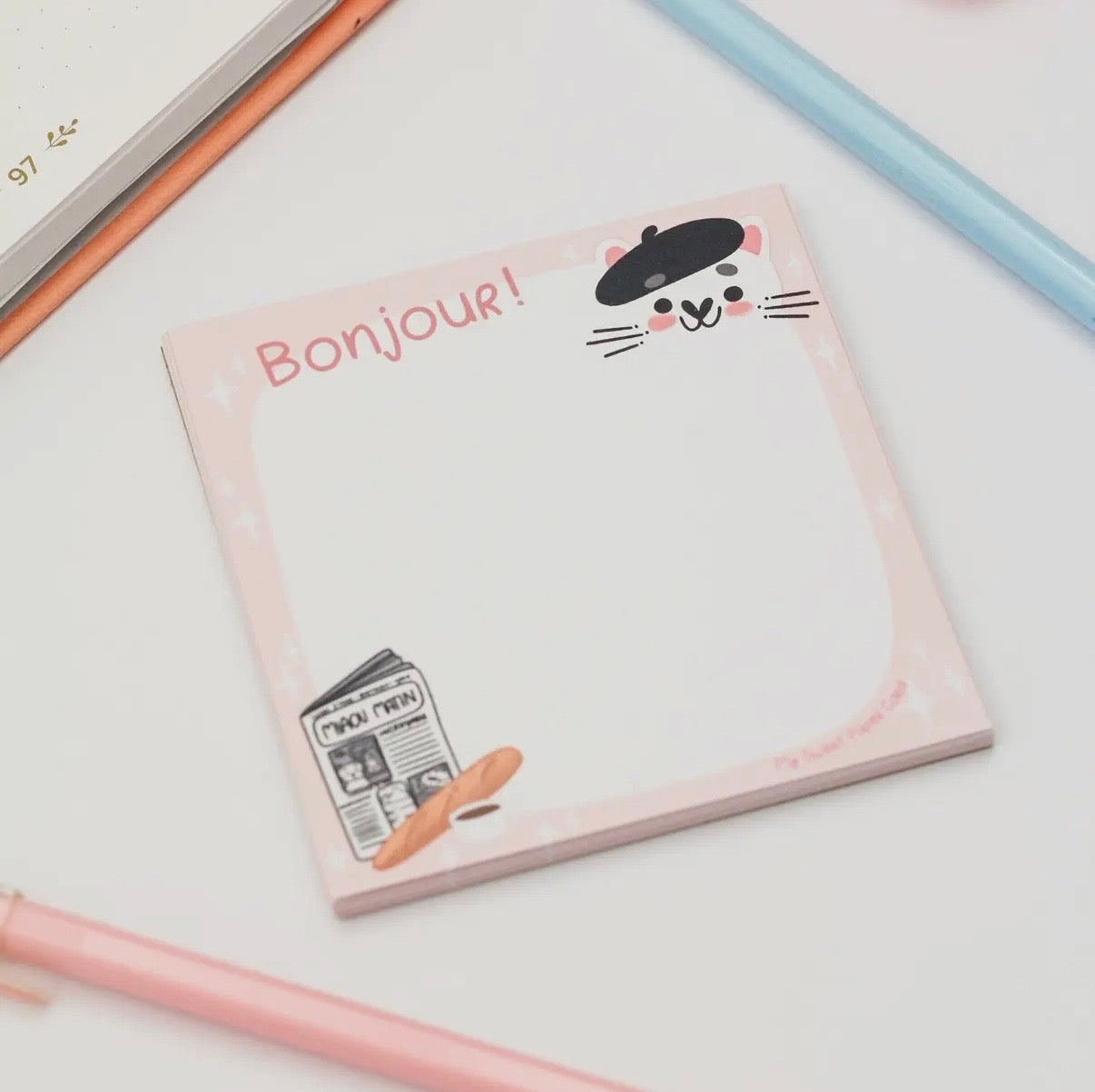 Om du brukar skriva ner dina tankar och att-göra-listor på lösa papperslappar är detta söta memohäfte perfekt för dig.Den franska katten med basker och baguette hälsar dig varmt med ett "Bonjour!".